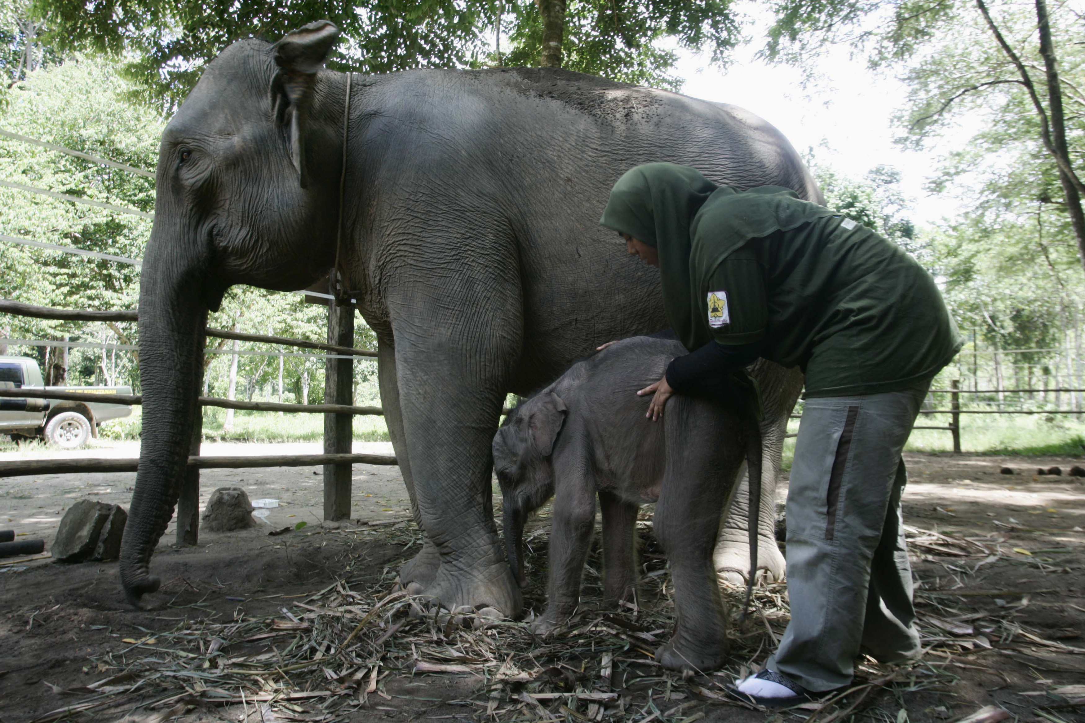 Δεν φεύγει από το πλευρό της μαμάς της η Ayu Rosalina, το ελεφαντάκι της Σουμάτρας που ήρθε μόλις χθες στον κόσμο και φιλοξενείται στο καταφύγιο Conservation Response Unit Sampoiniet, στην επαρχία Άτσεχ της Ινδονησίας.