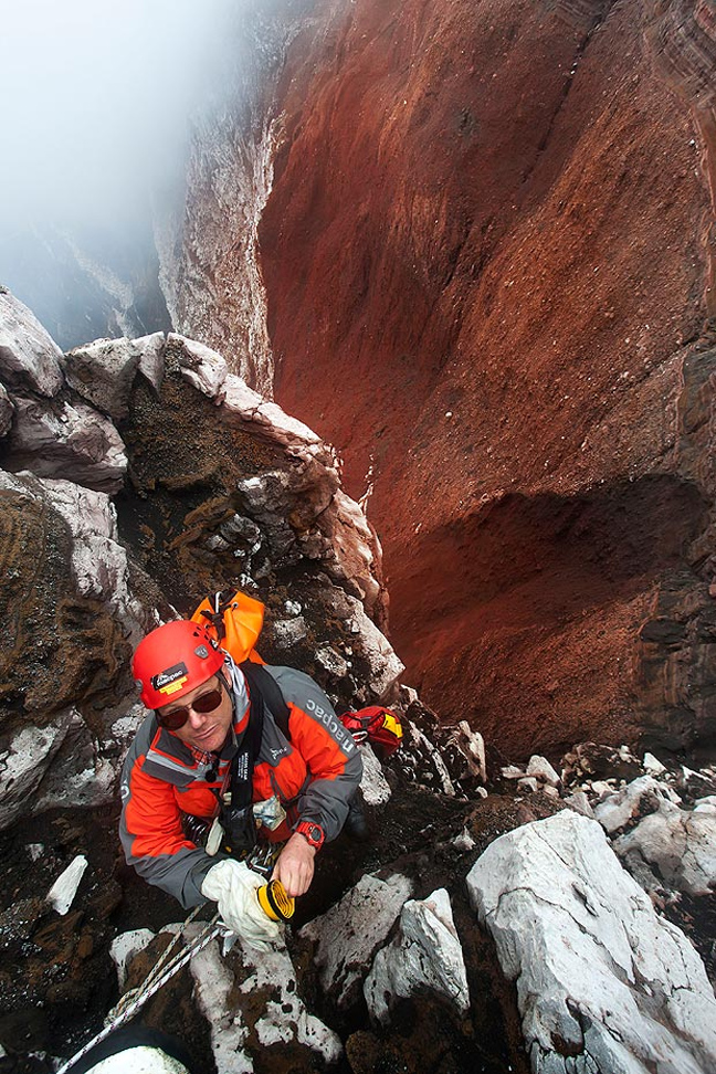 Αφού κατασκήνωσε με την ομάδα του για 38 ημέρες και κατέβηκε πλαγιά 400 μέτρων, έμεινε για 45 λεπτά πάνω από την καυτή άβυσσο του ηφαιστείου, φορώντας ειδική στολή ανθεκτική στη ζέστη.