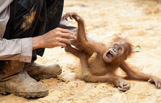 Με τα μάτια ορθάνοιχτα από το φόβο και βλέμμα που «μιλάει από μόνο του» ο μικρός ουρακοτάγκος προσπαθεί να κοιτά τον άνθρωπο που τον πλησιάζει.