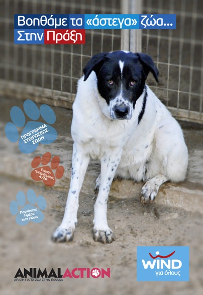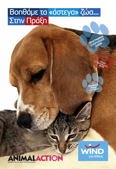 Για δεύτερη χρονιά η Wind, στο πλαίσιο του προγράμματος Εταιρικής Υπευθυνότητας «Στην Πράξη», μέσω του οποίου η εταιρεία αναπτύσσει δράσεις που αφορούν στην υπεύθυνη επιχειρηματικότητα, το περιβάλλον και την κοινωνία στηρίζει την προσπάθεια φροντίδας προς τα «άστεγα» ζώα και σε συνεργασία με την Animal Action (πρώην Ελληνικό Ταμείο Μέριμνας Ζώων- GAWF) συνεχίζουν το πρόγραμμα στειρώσεων αδέσποτων ζώων στην Αττική.