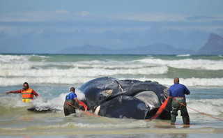Κλειστό παρέμεινε ένα μεγάλο τμήμα της ακτογραμμής στην περιοχή Muizenberg κοντά στο Cape Town στη Νότια Αφρική την περασμένη Κυριακή, καθώς οι αρχές προσπαθούσαν να απομακρύνουν από την ακτή ένα τεράστιο κουφάρι φάλαινας που εκβράστηκε από τη θάλασσα.