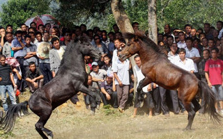 Με την αδρεναλίνη να ανεβαίνει και τα πλήθη να ουρλιάζουν γύρω τους, οι περήφανοι επιβήτορες μάχονται με πείσμα καθώς ρίχνονται ο ένας στον άλλο, σε μία παραδοσιακή κινέζικη αλογομαχία.