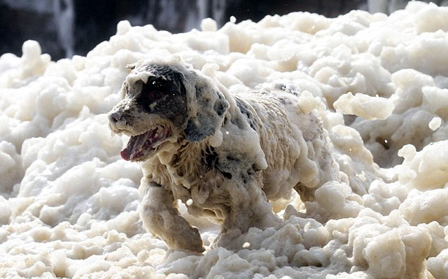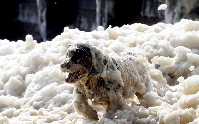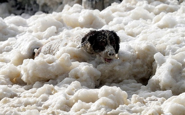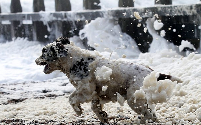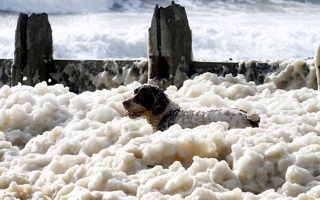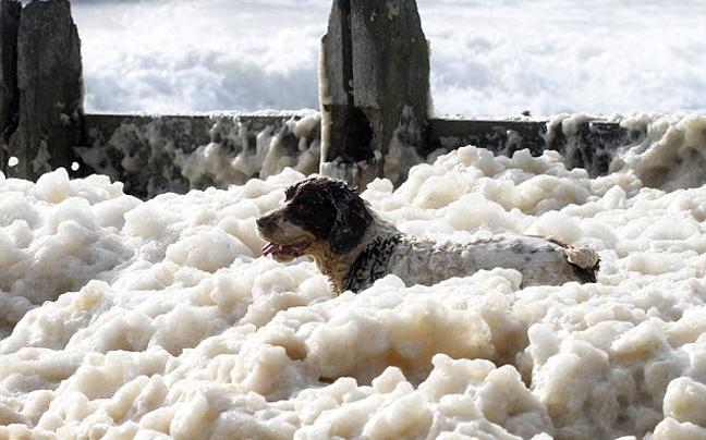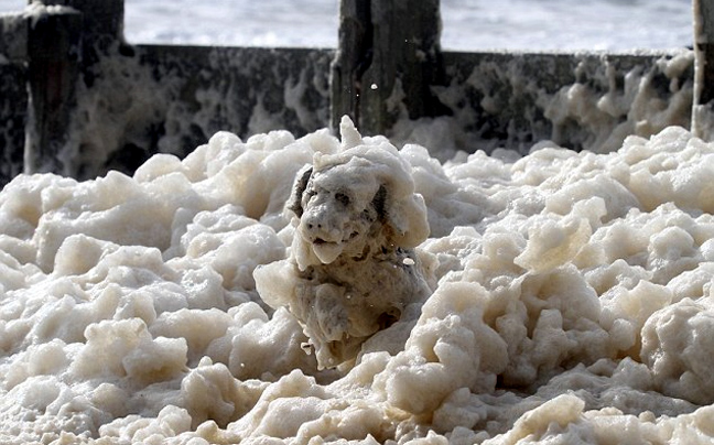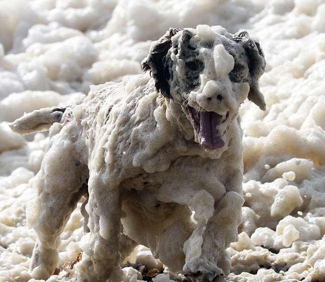 Ο αφρός σκέπασε ολόκληρο το παιχνιδιάρικο σκυλάκι, το οποίο ταλαιπώρησε αρκετά το αφεντικό του μέχρι να φύγει από τη θάλασσα. Το φαινόμενο αυτό συμβαίνει όταν οι έντονες βροχές στέλνουν οργανική ύλη που επιπλέει στον ωκεανό, όπου με την κίνηση γίνεται αφρός.