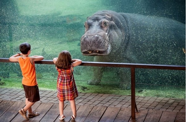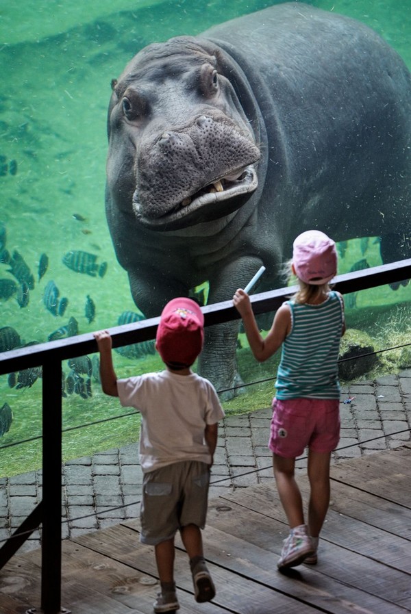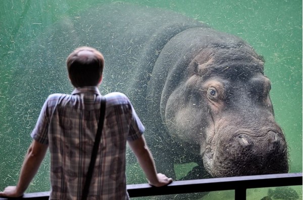 Στο ζωολογικό κήπο της Βαλένθια, στην Ισπανία, οι ιπποπόταμοι φιλοξενούνται σε μία δεξαμενή που δίνει τη δυνατότητα στους επισκέπτες να θαυμάζουν τα παχύδερμα, καθώς αυτά κολυμπούν κάτω από το νερό. Και πολλές φορές, εκτυλίσσονται σκηνές σαν αυτή, με τους ιπποπόταμους να πλησιάζουν στο τζάμι της δεξαμενής για να περιεργαστούν τους ανθρώπους.
