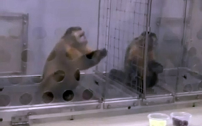 Δύο λευκοί καπουτσίνοι βρίσκονται σε δύο κλουβιά το ένα δίπλα στο άλλο και καλούνται να πάρουν και να δώσουν πίσω μία μικρή πέτρα για να… ανταμειφθούν.