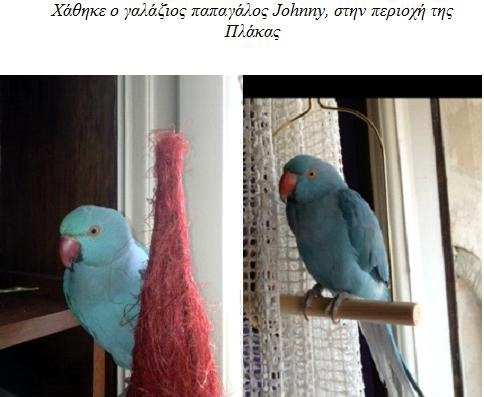 Γαλάζιος παπαγάλος ringneck χάθηκε στην περιοχή της Πλάκας. Ο παπαγάλος μπορεί να πωλείται από πλανόδιους πωλητές στο Μοναστηράκι. Δίνεται αμοιβή σε όποιον τον βρει.