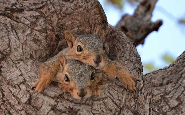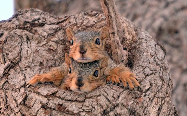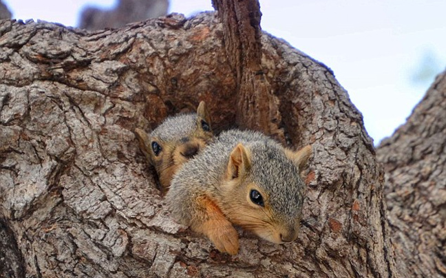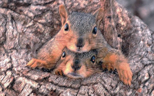 Δύο μικρά σκιουράκια βγάζουν διστακτικά το κεφάλι τους από τη φωλιά τους προτού κρυφτούν και πάλι μέσα.