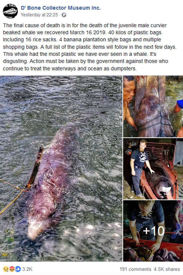 «Πρόκειται για τη μεγαλύτερη ποσότητα πλαστικού που έχει βρεθεί σε φάλαινα. Είναι αηδιαστικό. Πρέπει να ληφθούν μέτρα κατά όσων συνεχίζουν να αντιμετωπίζουν τους ωκεανούς ως μεγάλες χωματερές» προστίθεται στην ανάρτηση στο Facebook, όπως αναφέρει ο Guardian.