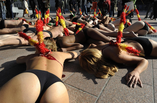 Ακτιβιστές ξαπλώνουν το 2008 έξω από το ευρωπαϊκό κοινοβούλιο στις Βρυξέλες, με βέλη «καρφωμένα» στην πλάτη τους, προκειμένου να διαμαρτυρηθούν για τη στήριξη των ταυρομαχιών από την Ε.Ε.