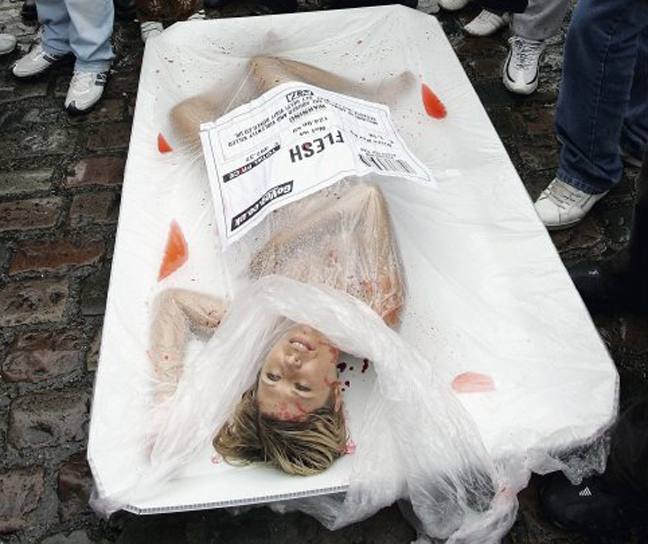 Ένα γυμνό μέλος της PETA ξάπλωσε σε συσκευασία πώλησης κρέατος, προκειμένου να παρακινήσει τον κόσμο να σκεφτεί τη χορτοφαγία.