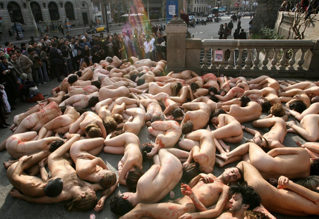Σχεδόν εκατό μέλη της οργάνωσης ξάπλωσαν γυμνοί σε πλατεία της Καταλονίας πραγματοποιώντας βουβή διαμαρτυρία.