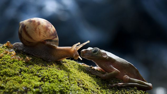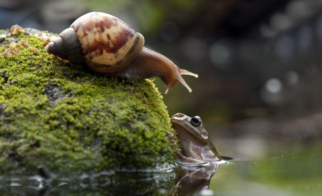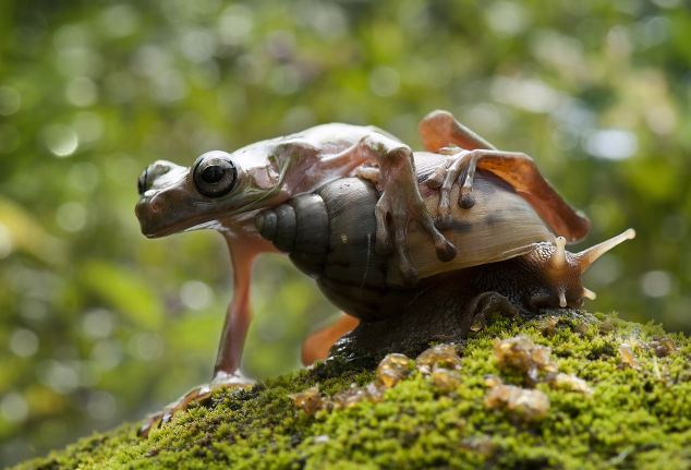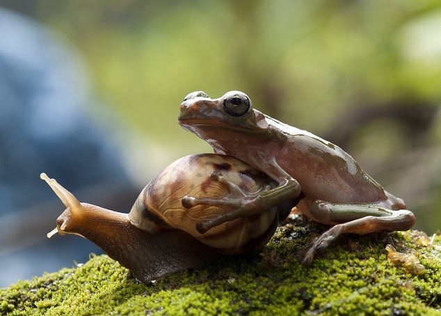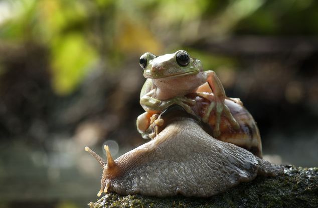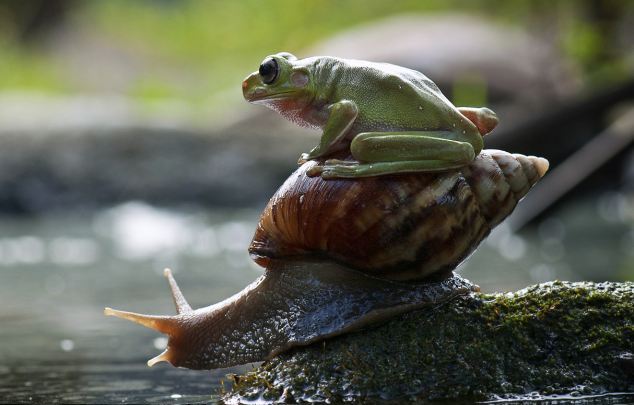 Με ένα του άλμα θα μπορούσε να φτάσει σίγουρα πιο γρήγορα εκεί που ήθελε. Φαίνεται όμως ότι ο συγκεκριμένος βάτραχος ήταν πολύ τεμπέλης, και προτίμησε να κάνει τη διαδρομή απολαμβάνοντας το τοπίο πάνω σε ένα σαλιγκάρι!