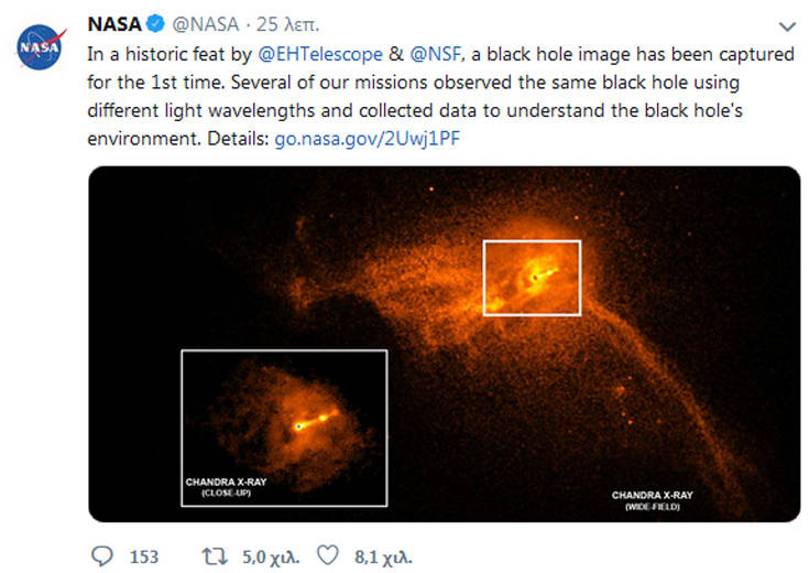 Η πρώτη εικόνα μιας μαύρης τρύπας που ελήφθη από το τηλεσκόπιο «Event Horizon Telescope-ΕΗΤ», χαιρετίστηκε σε όλο τον κόσμο ως μια σημαντική ανακάλυψη, που παρέχει οπτική πλέον απόδειξη για την ύπαρξη των μαύρων οπών, ενώ παράλληλα επιβεβαιώνει τις προβλέψεις της γενικής θεωρίας της σχετικότητας του Αϊνστάιν και ανοίγει νέες προοπτικές για την έρευνα στο σύμπαν.