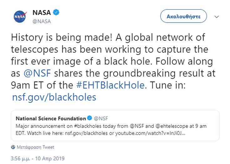 Την πρώτη εικόνα μιας μαύρης τρύπας με τη χρήση του τηλεσκοπίου Event Horizon έδωσε στη δημοσιότητα διεθνής επιστημονική ομάδα, με ελληνική συμμετοχή. Ένα επίτευγμα – ορόσημο στην αστροφυσική, που θέτει ουσιαστικά το πιο μεγάλο τεστ στη θεωρία του Αϊνστάιν για τη σχετικότητα.