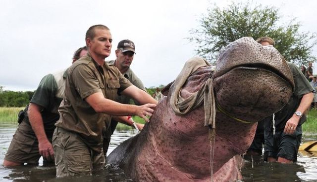 Έτσι, αφού νάρκωσαν το ζώο με βέλος στο οποίο είχε τοποθετηθεί το αναισθητικό, κατάφεραν να βγάλουν το ζώο στην άκρη της λίμνης. Για την επιχείρηση αυτή, απαιτήθηκε η συμμετοχή 12 ατόμων. Αφού ολοκλήρωσαν το δύσκολο έργο, το μόνο που απέμενε ήταν να χορηγήσουν στον ιπποπόταμο το φάρμακο που χρειαζόταν, με ενδοφλέβια ένεση.