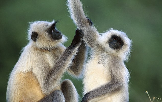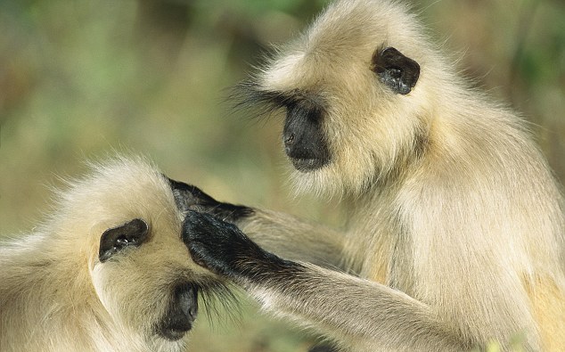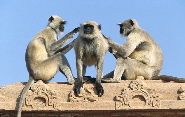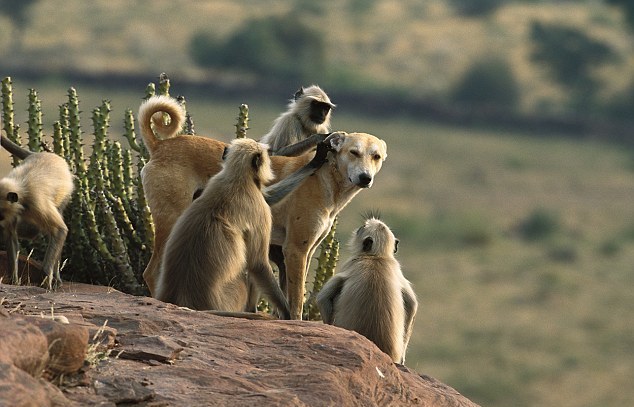 Το σκυλί μάλιστα, ξάπλωσε προκειμένου να είναι πιο άνετα καθώς οι πίθηκοι που ανήκουν στο είδος Gray langurs, του χάιδευαν τη γούνα.