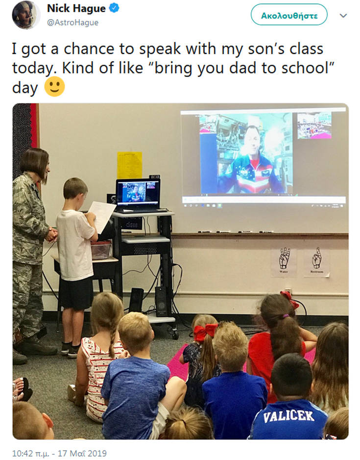 Ο Χαγκ μάλιστα είχε τη δυνατότητα να μιλήσει στην τάξη του γιου του. «Είχα την ευκαιρία να μιλήσω σήμερα στην τάξη του γιου μου. Είναι σαν “μέρα – φέρνω τον μπαμπά στο σχολείο”», σχολίασε αστειευόμενος ο αστροναύτης στις 17 Μαΐου, μέσω Twitter.