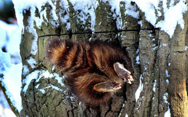 Το ζώο προσπαθούσε να βρει καταφύγιο από το χιόνι και επιχείρησε να περάσει μέσα από μια τρύπα ενός δέντρου στον ζωολογικό κήπο Cologne στη Γερμανία. Δεν υπολόγισε όμως ότι δεν χώραγε να βγει και έτσι σφήνωσε.