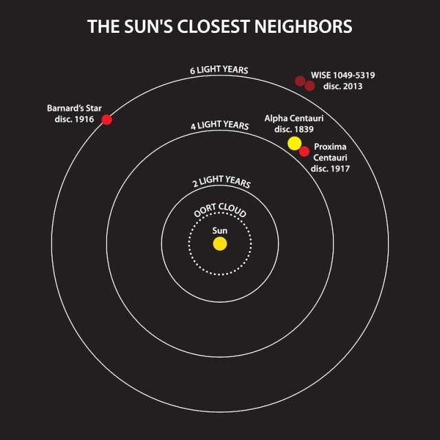 Το δεύτερο κοντινότερο άστρο, του Μπάρναρντ, απέχει περίπου έξι έτη φωτός και ανακαλύφθηκε το 1916, ενώ το πιο κοντινό στη Γη είναι το τριπλό αστρικό σύστημα Άλφα Κενταύρου, ένα από τα αχνά άστρα του οποίου, ο Εγγύς Κενταύρου, που ανακαλύφθηκε το 1917, απέχει μόλις 4,2 έτη φωτός.