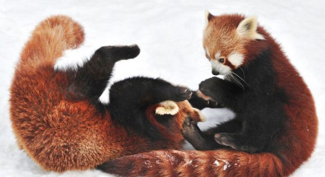 Τα συμπαθέστατα ζωάκια φιλοξενούνται στο ζωολογικό κήπο Tiergarten Schönbrunn της Βιέννης. Τις φωτογραφίες από την μεταξύ τους πάλη τράβηξε ο αυστριακός φωτογράφος Josef Gelernter.