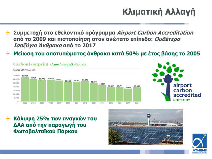 Ο ΔΑΑ συμμετέχει στο εθελοντικό πρόγραμμα Airport Carbon Accreditation από το 2009 και πιστοποιήθηκε του στο ανώτατο επίπεδο, έχοντας να επιδείξει Ουδέτερο Ισοζύγιο Ανθρακα από το 2017, καθώς κατάφερε να μειώσει το αποτύπωμα άνθρακα κατά 50%.