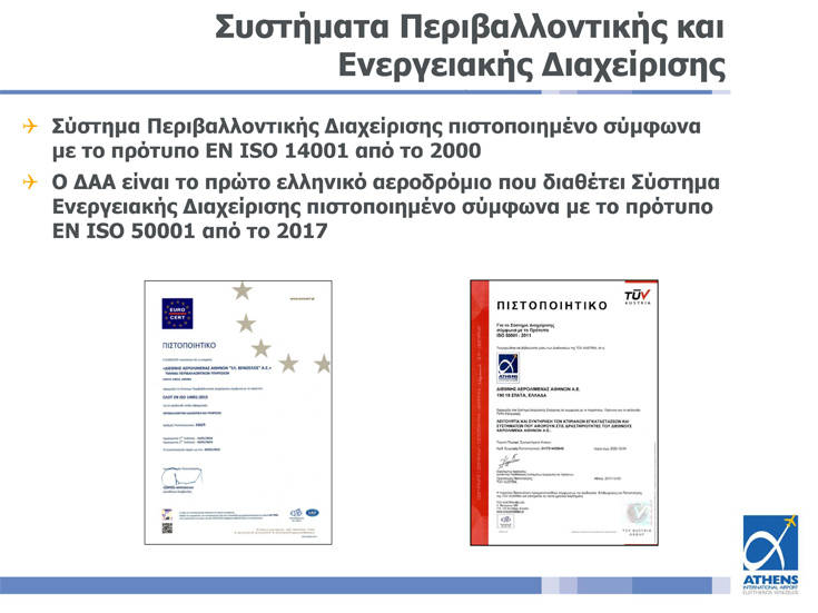 Ο ΔΑΑ έχει Σύστημα Περιβαλλοντικής Διαχείρισης πιστοποιημένο σύμφωνα με το πρότυπο EN ISO 14001 από το 2000 και είναι το πρώτο ελληνικό αεροδρόμιο που διαθέτει Σύστημα Ενεργειακής Διαχείρισης πιστοποιημένο σύμφωνα με το πρότυπο EN ISO 50001 από το 2017. Προχωρά σε παρακολούθηση ποιότητας αέρα εντός και εκτός του αεροδρομίου από το 1998: Μείωση εκπομπών μονοξειδίου από τα αεροσκάφη κατά 35% από το 2002. Εγκατέστησε και λειτουργεί σταθμούς στους δήμους γύρω από το αεροδρόμιο και λήψη μέτρων για τη μείωση της ηχορύπανσης όχι μόνο από τα αεροσκάφη αλλά και από τα οχήματα και άλλες πηγές.