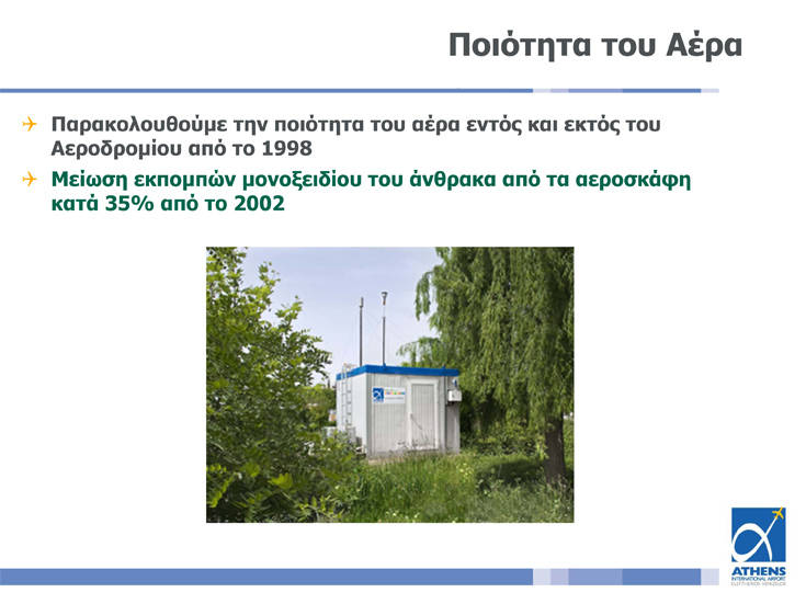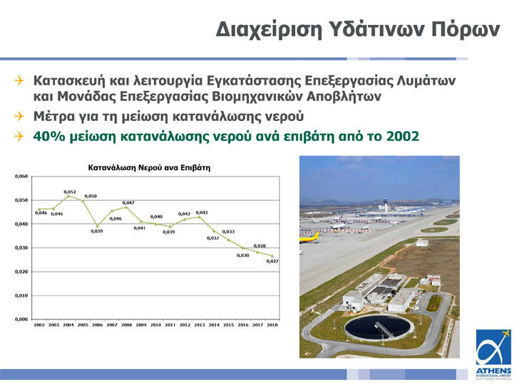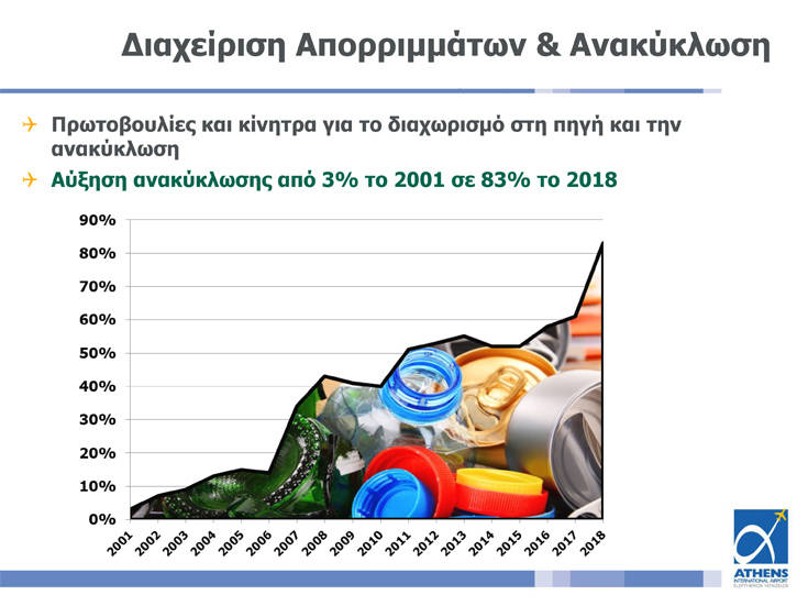 Έχει καταφέρει να μειώσει κατά 40% την κατανάλωση ανά επιβάτη από το 2002, να αυξήσει την ανακύκλωση από 3% το 2001 σε 83% το 2018.