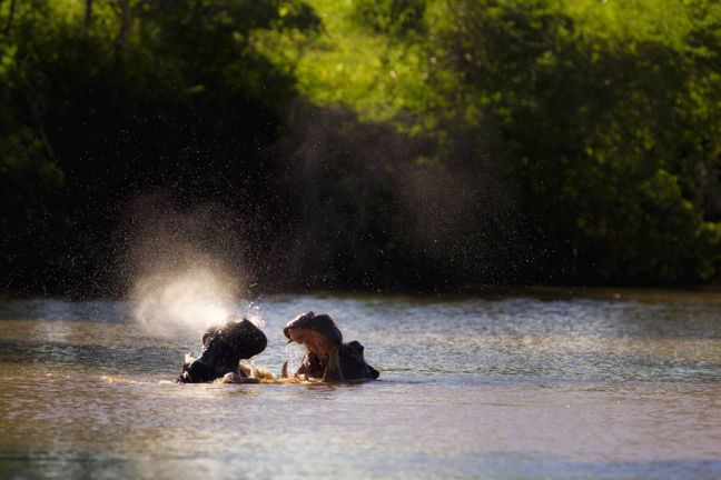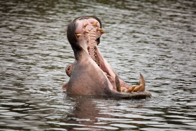 Μάλλον δεν χόρτασε ύπνο ο ιπποπόταμος της φωτογραφίας και γι’ αυτό χασμουριέται δείχνοντάς μας τα κοφτερά του δόντια στη διάρκεια της πρωινής του κολύμβησης.