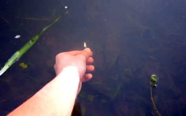Το μόνο που κάνει είναι να βάζει το χέρι του στο νερό μαζί με ένα μικρό δόλωμα και μέσα σε λίγα δευτερόλεπτα εμφανίζεται ένα ψάρι.
