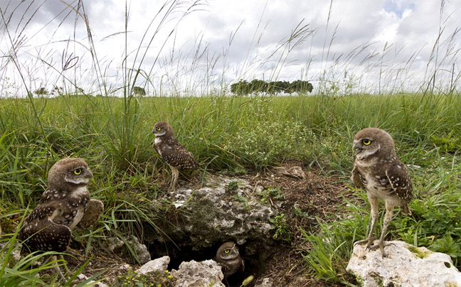 Με τα αρπακτικά να κυκλοφορούν ελεύθερα είναι λογικό αυτές οι κουκουβάγιες του είδους Athene cunicularia να κοιτούν τρομαγμένες την κάμερα. Το ξεχωριστό με αυτά τα ζώα με τα μεγάλα μάτια είναι ότι προτιμούν να «τρυπώνουν» στο έδαφος παρά σε δέντρα.