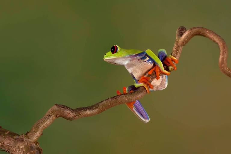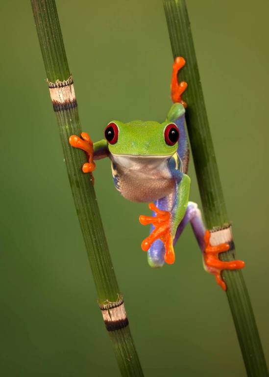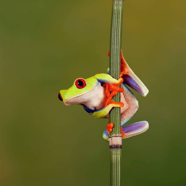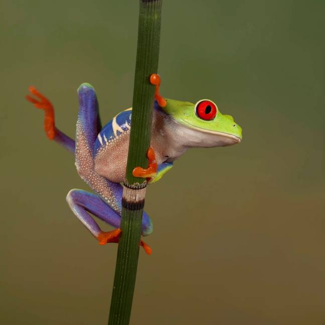 Έχοντας κουλουριασμένο το σώμα του γύρω από ένα καλάμι ο βάτραχος με τα φανταχτερά χρώματα κάνει παιχνίδια στον φακό της κάμερας. Και μπορεί να δίνει την εντύπωση ότι είναι έτοιμος να πέσει, όμως τελικά κάνει την έκπληξη και παραμένει ακίνητος για περίπου μισή ώρα πριν τελικά πηδήξει.