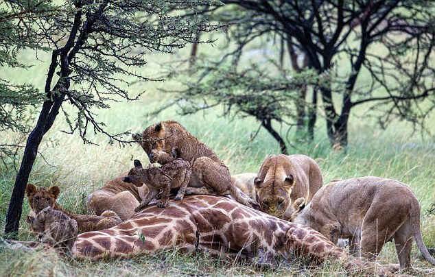 Οι «μεγάλοι» της παρέας κατάφεραν να αρπάξουν μια μεγάλη αρσενική καμηλοπάρδαλη, το κρέας της οποίας θα τους φτάσει για μερικές ημέρες!