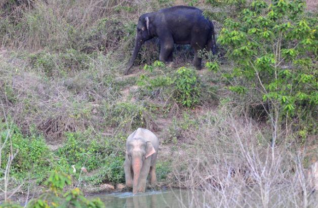 Το ελεφαντάκι απεικονίζεται να πίνει νερό στο Kaeng Krachan, το μεγαλύτερο Εθνικό Πάρκο της χώρας, στην επαρχία Πετσαμπούρι με ένα κοπάδι ασιατικών ελεφάντων.