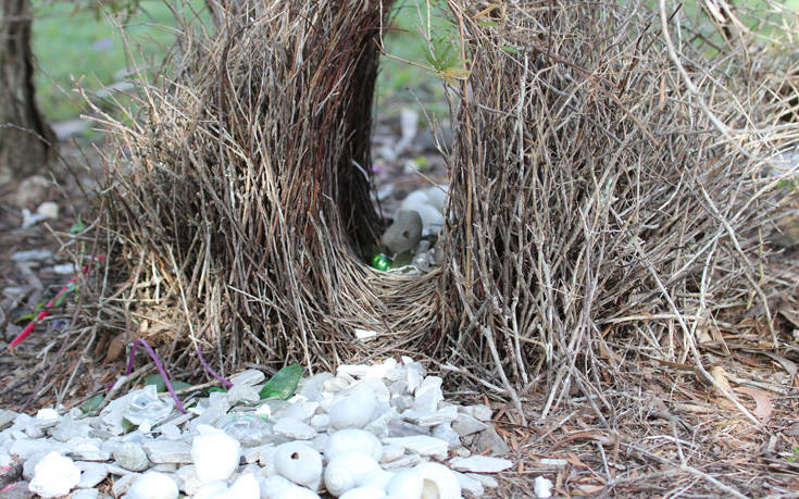 Τα περισσότερα φτιάχνουν αυτές τις χαρακτηριστικές φωλιές, καθαρίζουν την αυλή και φέρνουν αντικείμενα συγκεκριμένου κάθε φορά χρώματος. Το great bowerbird τα κουτσοβολεύει με κλαδάκια, πετρούλες, κοκαλάκια και κελύφη σαλιγκαριών, μιας και το θηλυκό του νοιάζεται για άλλα πράγματα.