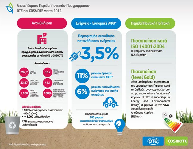 Η COSMOTE και οι θυγατρικές του Ομίλου ΟΤΕ στη Ν.Α έχουν πιστοποιηθεί κατά το πρότυπο ISO 14001:2OO4 και ο ΟΤΕ βρίσκεται σε διαδικασία ανάπτυξης του παραπάνω Συστήματος Περιβαλλοντικής Διαχείρισης.