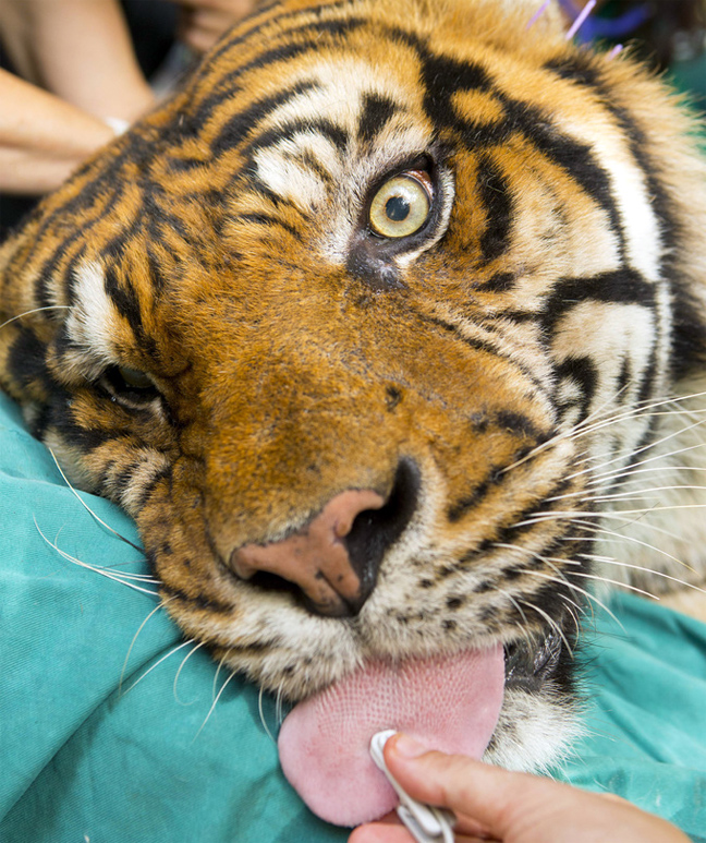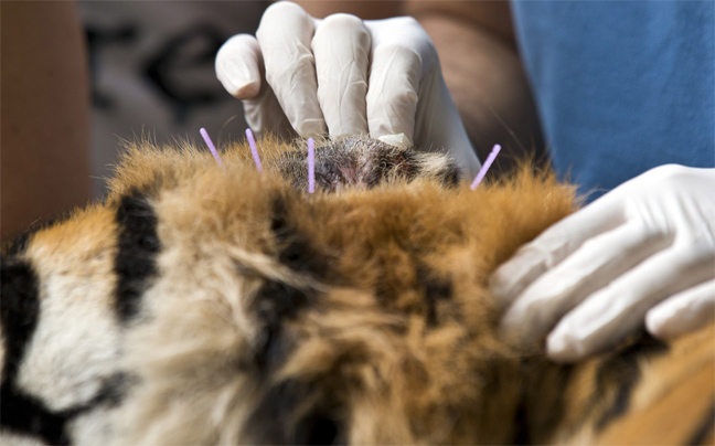 Ο 14χρονος τίγρης που ονομάζεται Pedang υποφέρει από μια χρόνια μόλυση στο αυτή. Την Κυριακή ένας κτηνίατρος αποφάσισε να δοκιμάσει τη μέθοδο του βελονισμού, τοποθετώντας στο άγριο ζώο ροζ βελόνες στο αυτί και σε άλλα σημεία του σώματός του.