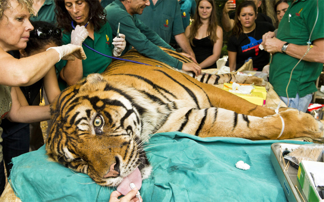 Φωτογραφίες με κτηνίατρους, που προσπαθούν να θεραπεύσουν ένα τίγρη της Σουμάτρας σε ισραηλινό ζωολογικό κήπο, δόθηκαν στη δημοσιότητα.