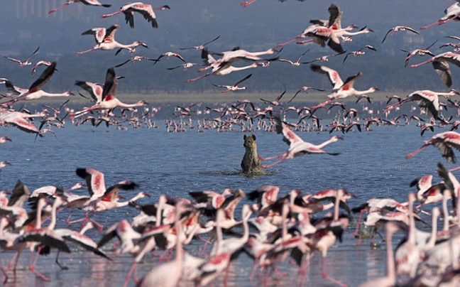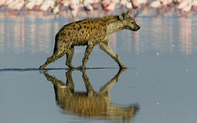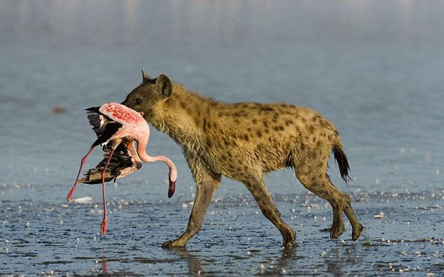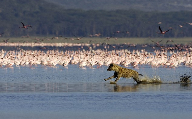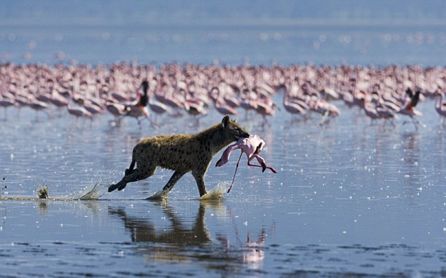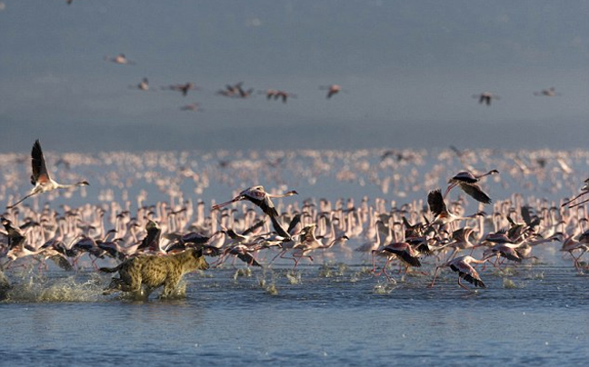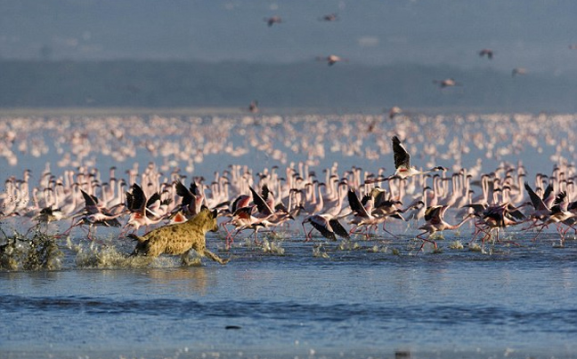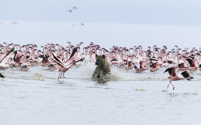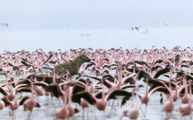 Οι φωτογράφοι άγριας ζωής Michel και Christine Denis-Huot απαθανάτισαν τη στιγμή που μια ύαινα έψαχνε το γεύμα της ανάμεσα σε χιλιάδες φλαμίνγκο στη λίμνη Nakuru της Κένυας.