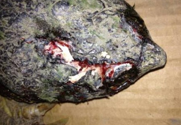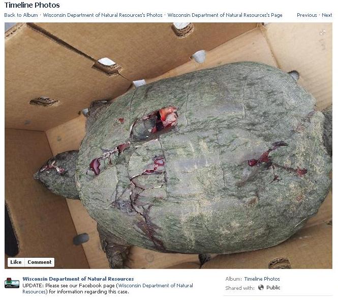 Η θηλυκή χελώνα βρέθηκε ετοιμοθάνατη στο γήπεδο γκολφ Delbrook στο Delavan του Wisconsin στις ΗΠΑ. Το καβούκι της ήταν γεμάτο τρύπες ενώ την είχαν χτυπήσει και στο δεξί μάτι.