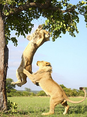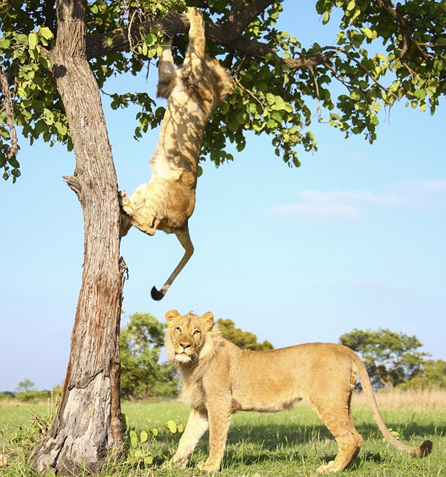 Το πρώτο λιοντάρι σκαρφαλώνει σε ένα δέντρο ενώ το δεύτερο το κοιτάζει και κάποια στιγμή το… αρπάζει από την ουρά.