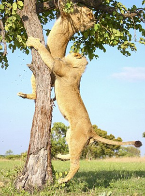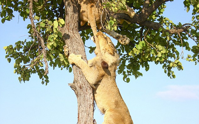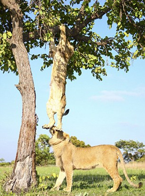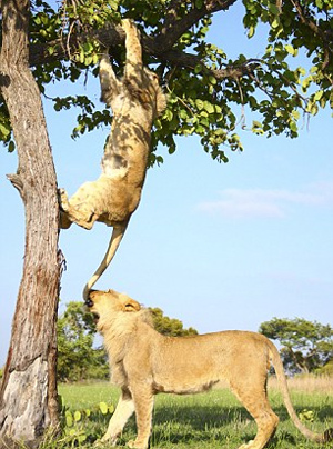 Καθώς δεν καταφέρνει να το τραβήξει κάτω, σκαρφαλώνει κι αυτό στον κορμό του δέντρου και τότε αρχίζει το πραγματικό παιχνίδι που δεν είναι όμως «παίξε γέλασε» όταν έχεις να κάνεις με λιοντάρια…