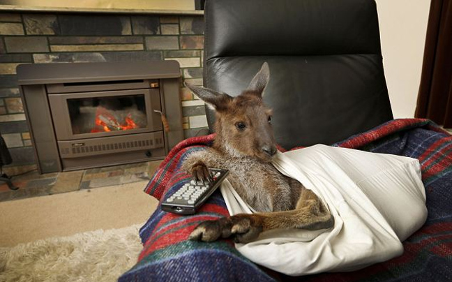 Κάθεται κουλουριασμένος μπροστά από την τηλεόραση, μετά από μια κουραστική μέρα στο πάρκο προστασίας άγριων ζώων.