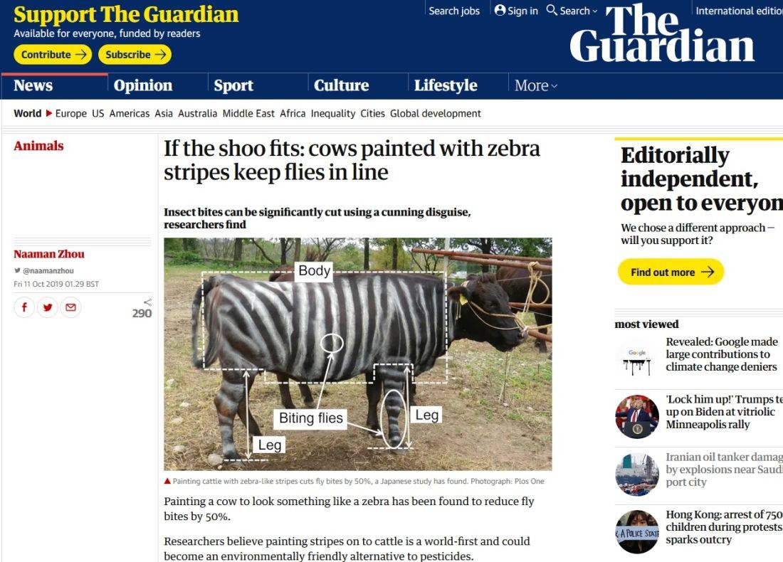Η παρούσα μελέτη, που δημοσιεύτηκε στην επιστημονική επιθεώρηση «Plos One» έδειξε ότι η μεταμφίεση των αγελάδων σε ζέβρες μειώνει τα τσιμπήματα των μυγών καθώς αυτές δεν μπορούν να εντοπίσουν το ίδιο εύκολα την κίνηση ώστε να τσιμπήσουν το ζώο.