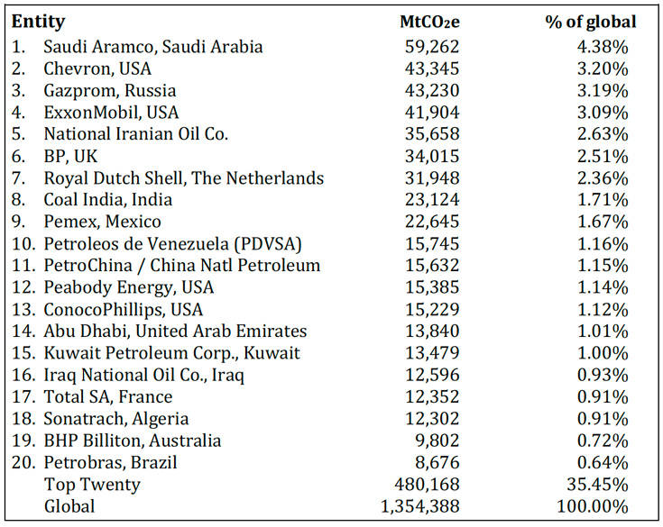 Το Climate Accountability Institute μας λέει πως αυτές οι εταιρίες ευθύνονται για 480 δισεκατομμύρια τόνους διοξειδίου του άνθρακα και μεθανίου από το 1965 έως και σήμερα, αντιστοιχώντας στο 35% της συνολικής συγκέντρωσης αερίων του θερμοκηπίου μεταξύ 1965-2017. Δώδεκα από τις 20 εταιρίες είναι μάλιστα κρατικές.