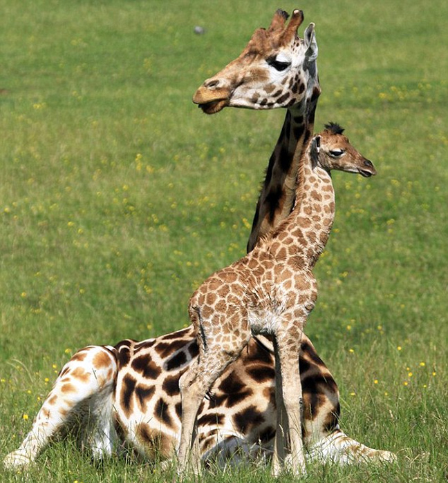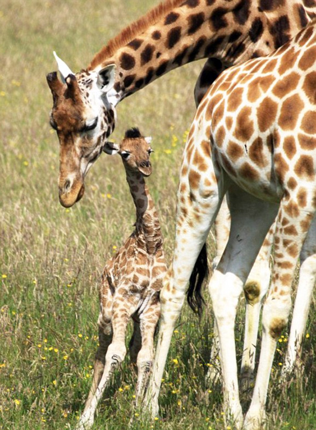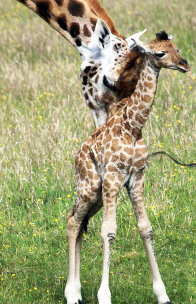 Παρότι το νεογέννητο δείχνει μικρό δίπλα στη μητέρα του, που έχει ύψος σχεδόν 5,5 μέτρα, είναι και το ίδιο εντυπωσιακά μεγάλο για νεογέννητο: έχει ήδη ύψος δύο μέτρα.