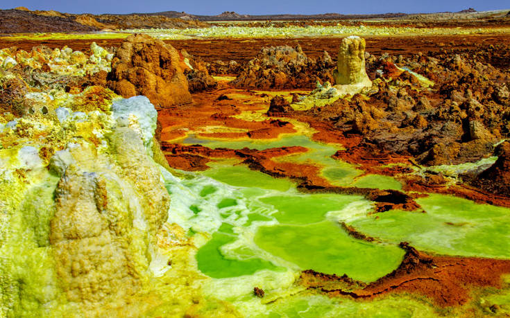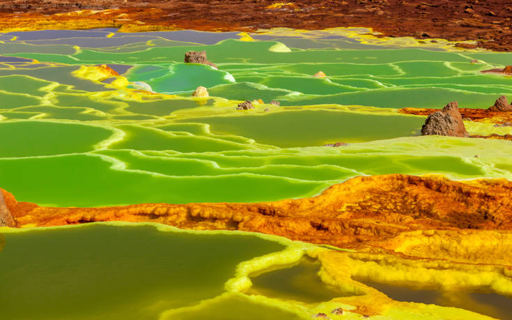 Πηγές Dallol τις λένε και είναι μια απόκοσμη υδροθερμική κόλαση με καυτό νερό, θειικό οξύ και καμένο αλάτι.