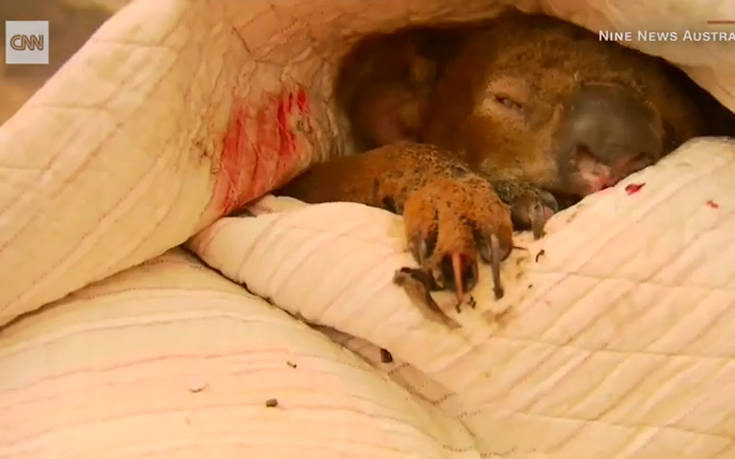 Η κάμερα κατέγραψε αυτή τη φορά μια γυναίκα να σώζει ένα μικρό κοάλα μέσα από τις φλόγες, ενώ καιγόταν ζωντανό. Εκείνο προσπαθούσε να απομακρυνθεί αλλά είχε ήδη εγκαύματα στα πόδια και εμφανώς υπέφερε. Ενώ ακούγεται να κλαίει από τον πόνο και τον τρόμο, η γυναίκα του δίνει λίγο νερό και βρέχει τα πόδια του.