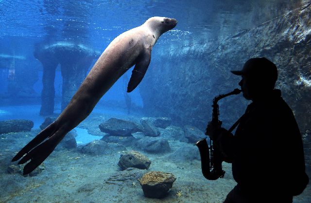 Ώρα… μουσικής στο Ζωολογικό Κήπο Taronga στο Σίδνεϊ της Αυστραλίας. Ο εικονιζόμενος σαξοφωνίστας είναι ο Steve Westnedge, ακροατής μία «φώκια λεοπάρδαλη», ο «Casey» και στόχος της μίνι «συναυλίας» η μελέτη των αντιδράσεων της φώκιας στους διαφορετικούς ήχους.