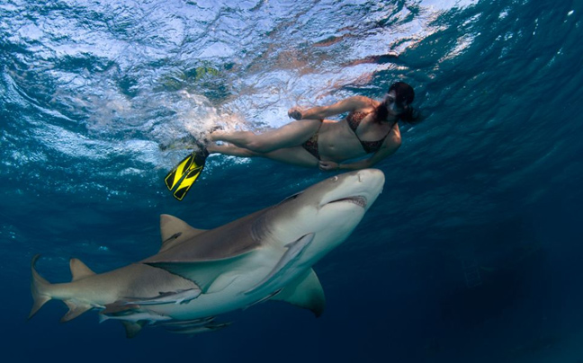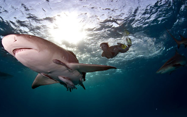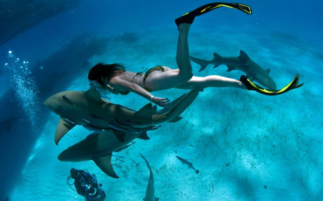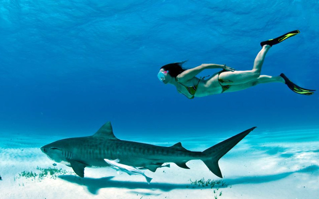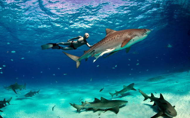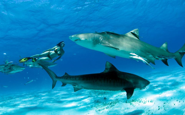 Οι φωτογραφίες που ακολουθούν αποτυπώνουν το κολύμπι της δύτριας με καρχαρίες- τίγρεις κοντά στις Μπαχάμες. Το συγκεκριμένο είδος θεωρείται από τα πλέον θανατηφόρα στον κόσμο.