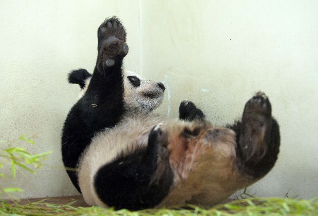 Ωστόσο, η συμφωνία του «δανεισμού» τους προβλέπει πως εάν υπάρξει απόγονος, αυτός ανήκει στη Λαϊκή Δημοκρατία της Κίνας και θα πρέπει να μεταφερθεί εκεί μόλις κλείσει δύο χρόνια ζωής, ηλικία στην οποία τα πάντα εγκαταλείπουν τη μητέρα τους στη φύση.